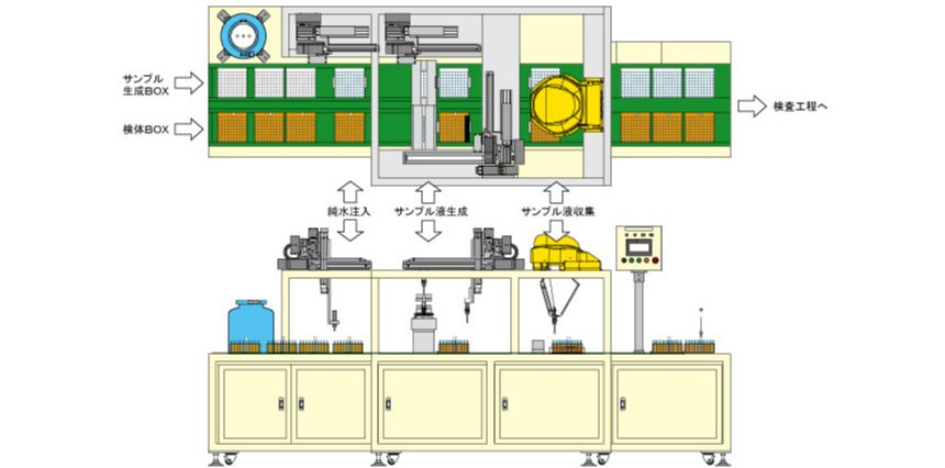 複数個の検査容器がセットされている検体BOXから、検体サンプルを取り出してサンプル液を生成します。その生成したサンプル液を検体BOX毎に1つの容器に収集する装置です。