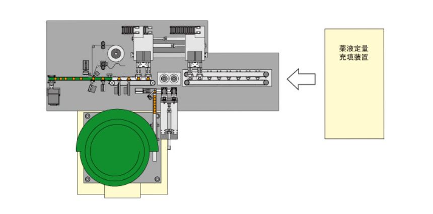 前工程で充填された薬液ボトルに、パーツフィーダーから供給されたキャップを装着し、一定量のトルクで締付けを行います。