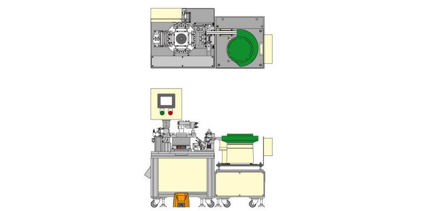 オペレータがセットした複数個のペースト状薬液充填済みチューブに、パーツフィーダから供給されたキャップを装着し、所定の力で打栓する装置です。